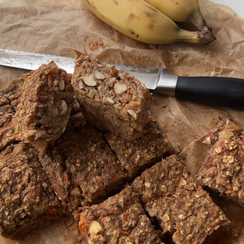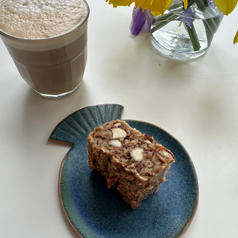 Konsistensen er som en fast havregrød med sødme fra banan og gulerod - og knasende mandler, den smager så godt … og lidt af kage.