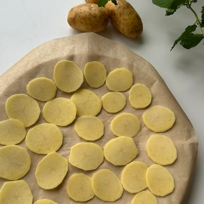 - Læg de tynde skiver kartoffel på bagepapiret, drys LIDT salt på og sæt tallerkenen i mikroovnen i 5 min ved 800W