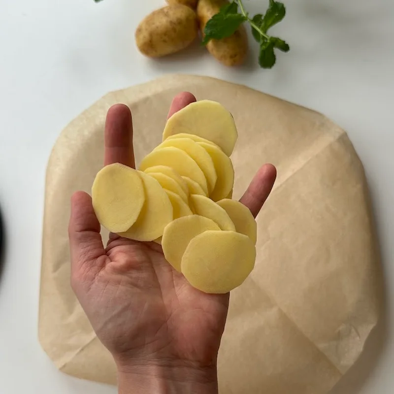 - Ta én kartoffel med/uden skæl og skær den i tynde skiver a 2 mm, enten med en kniv eller på mandolinjern