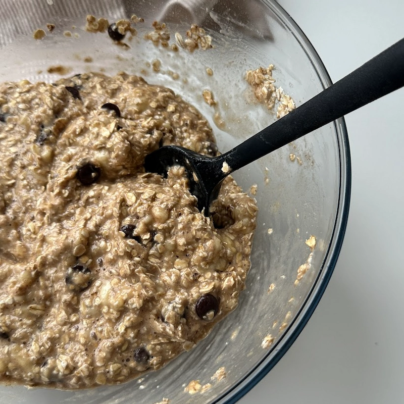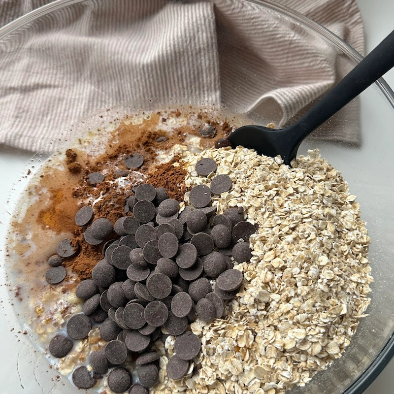 - Tilsæt havregryn, bagepulver, kanel, salt, mælk, sirup og chokoladeknapper