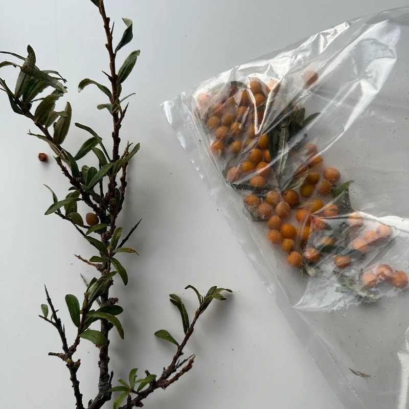 Både blad og bær er frosne, og varmen fra dine hænder får bladene til at sætte sig på dine fingrer – brug en pincet, oliventang eller lign til at nippe havtornene op med.