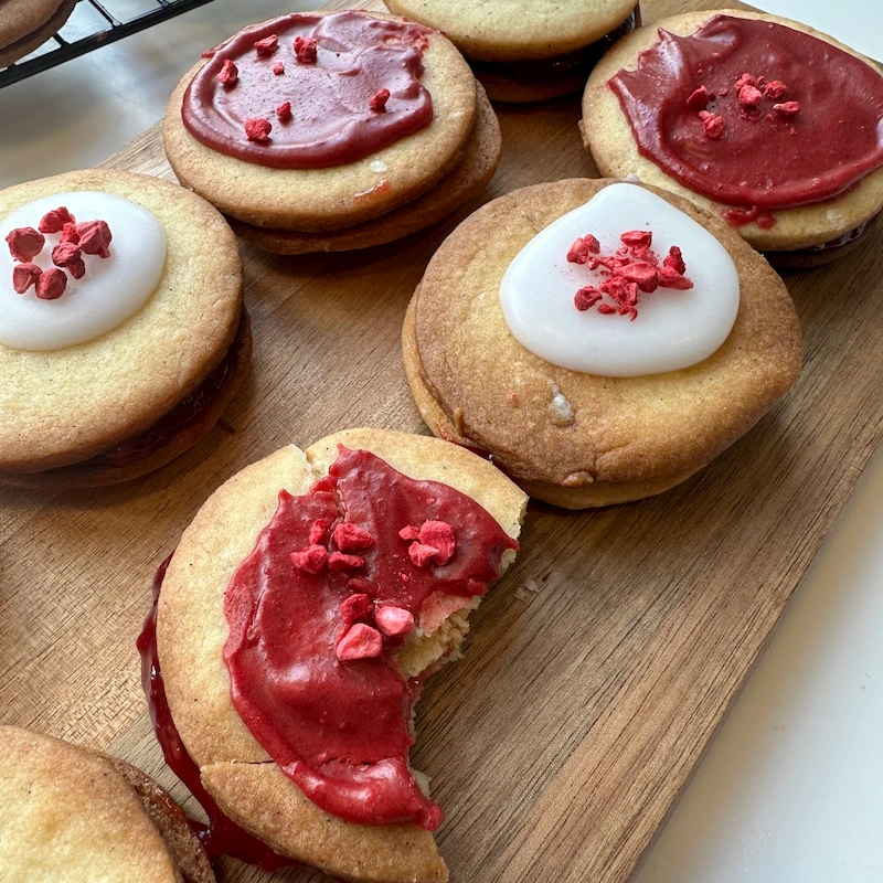 - De afkølede kager samles med hindbærsyltetøj på bunden - og toppen pyntes med glasur og topping