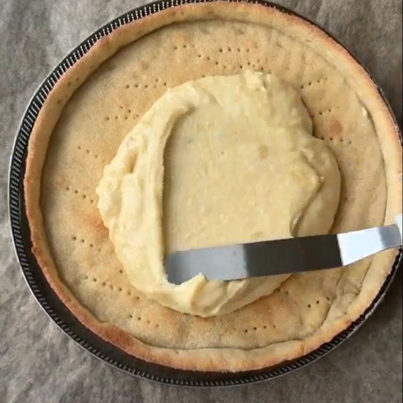 - Når mørdejen er forbagt, så lad den køle let af inden remoncen fordeles på tærtebunden. Friske hindbær kommes ovenpå remoncen