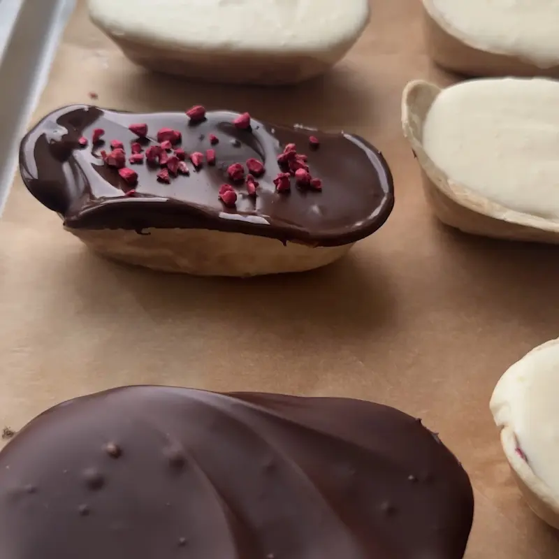 - Sæt isbådene på frost i 3 timer og smelt herefter chokolade og dyp toppen af isbådene i den lækre tempereret chokolade