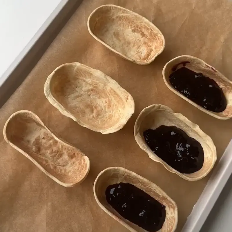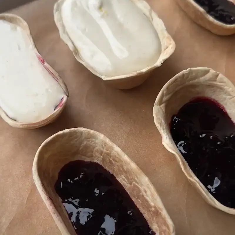 - Kom skallerne op på en plade/tallerken der kan gå i fryseren. Kom 1/2 spsk solbær kompot i bunden af hver isbåd og fyld ismassen i