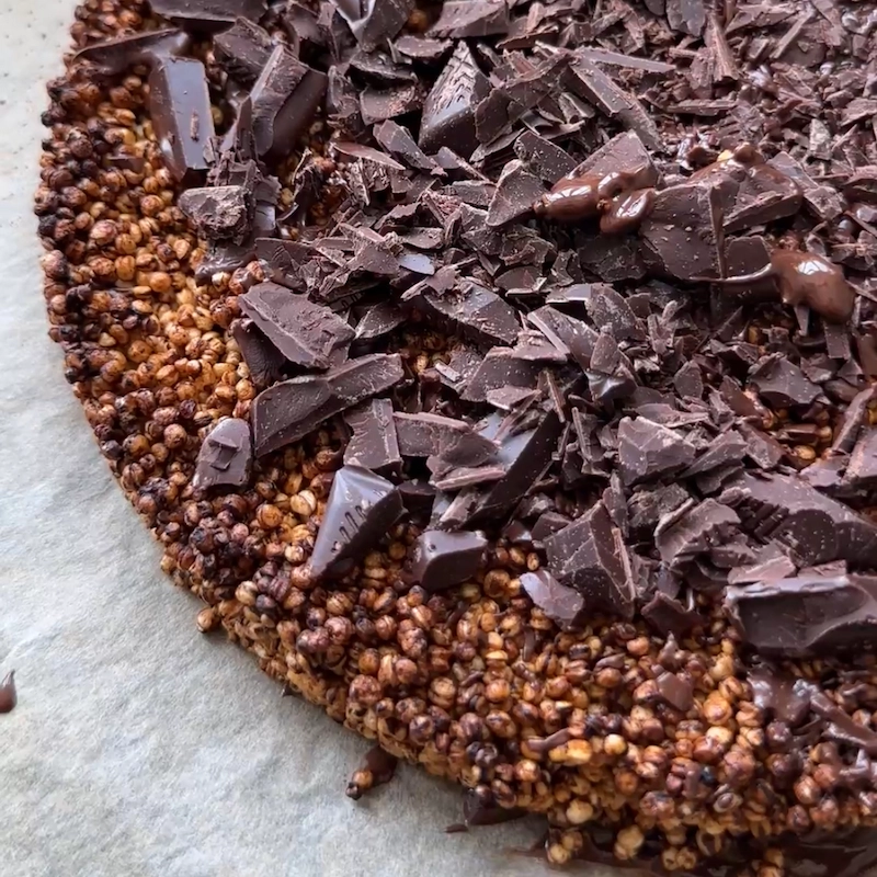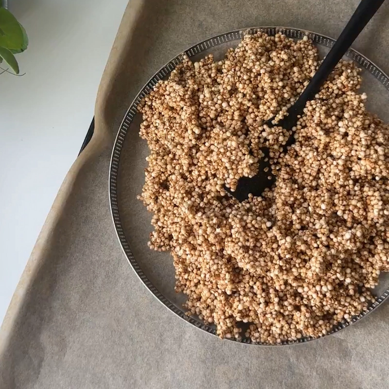 Bunden er lavet af quinoa CRUNCH-barer, som giver en sprød og nærende base med et hint af syndig morgenmadsstemning.