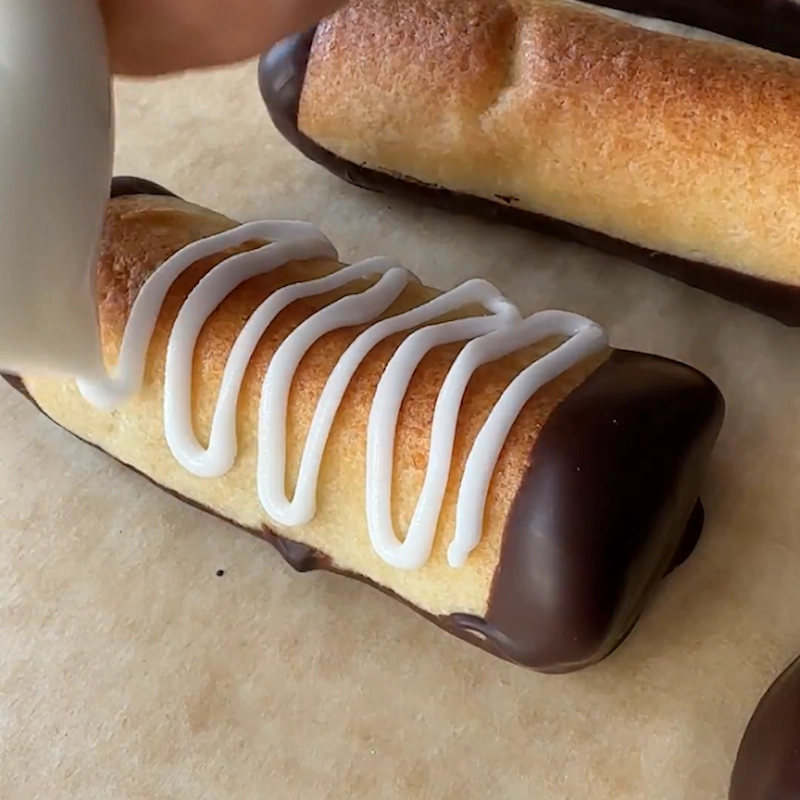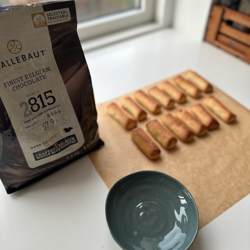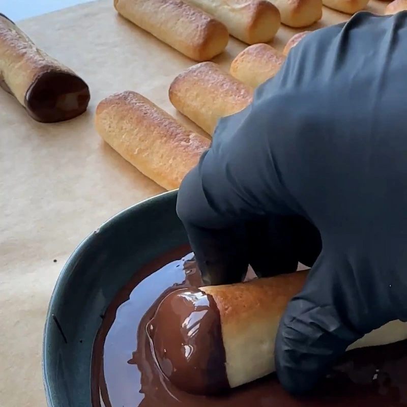 - Dyp begge ender og bunden af stykkerne og stil dem til tørre på bagepapir.