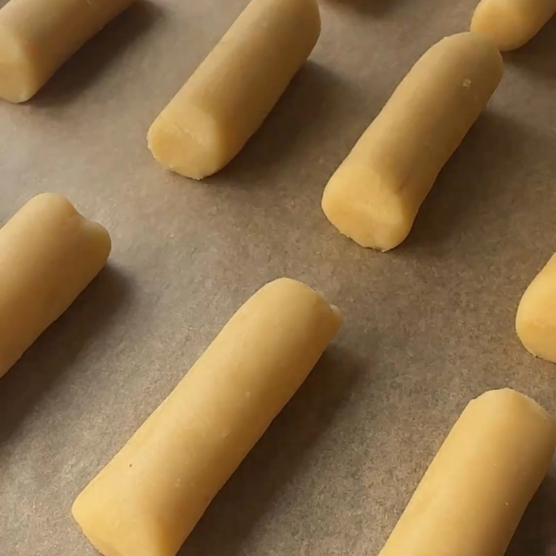 - Bland alle ingredienserne og rul marcipan massen i stænger. Skær herefter stykker af ca 45 g/stykket og 6 cm i længden.