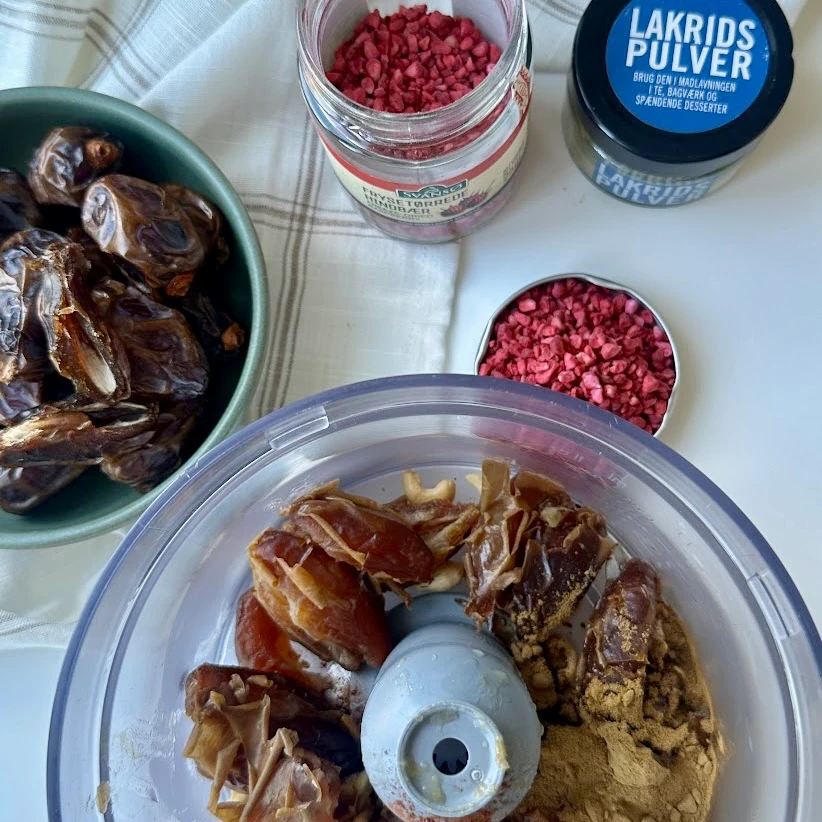 Dadelkugler med lakrids og hindbær 🩷 – 5 ingredienser, masser af smag og naturlig nydelse