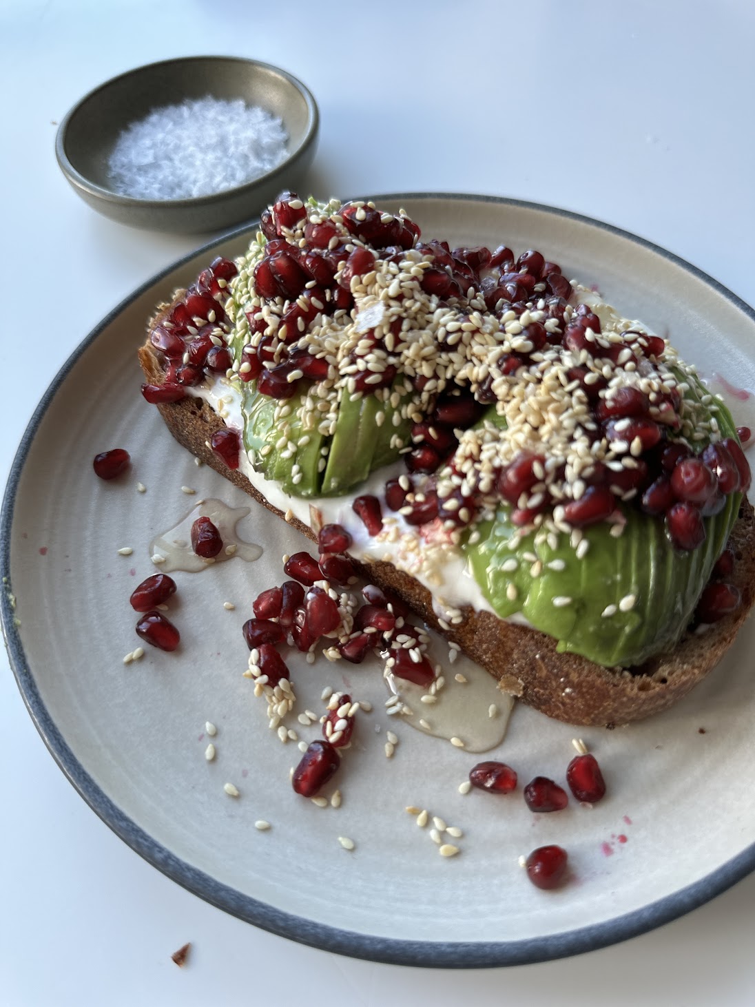 - Halver en avocado og skær begge dele i skiver og kom oven på sammen med kernerne fra granatæblet og lidt ristede sesam. De ristede sesam laver du hurtigt på en pande ved højvarme indtil de er gyldne. Husk at rør i dem undervejs