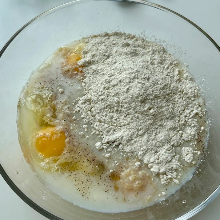 - Pisk æggene sammen med mælk, yoghurt, sukker, vanilje og salt i en stor skål. Tilsæt mel, bagepulver og revet marcipan og citronskal - og rør det hele godt sammen til en ensartet dej