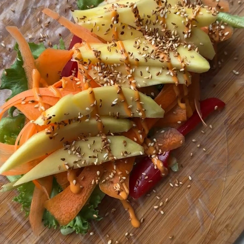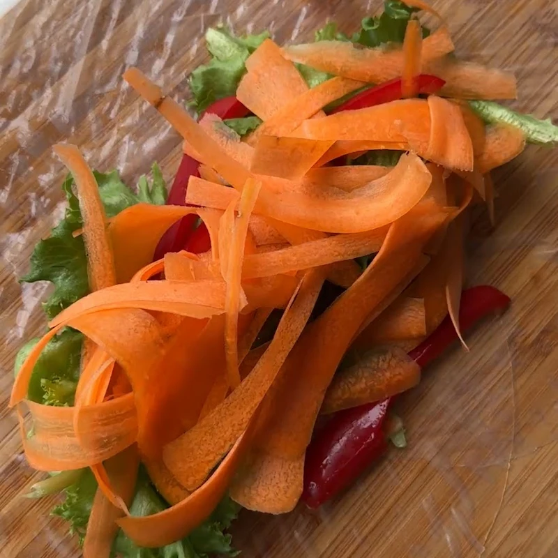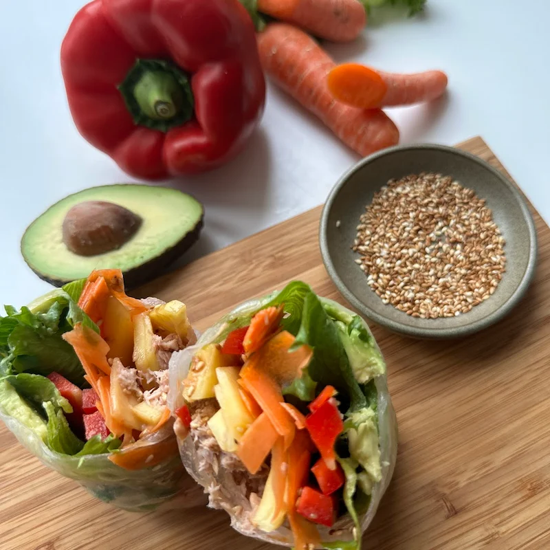 - Dyp rispapiret i vand og læg tre sammen så de danner en trekant. Kom alle grønsagerne og tunfisken på midten af papiret og drys med sesamfrø, giv det en stribe chilimayo og hoisinsauce