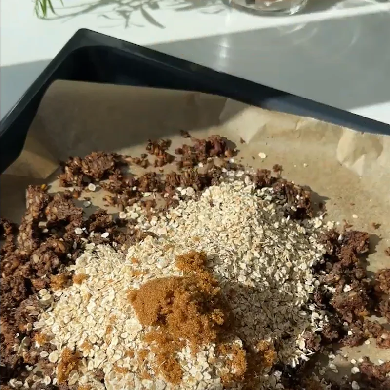 - Del rugbrødet med hænderne, der må gerne være “klumper/stykker” men obs de skal ikke være større end de bager og tørrer i ovnen uden at resten brænder på. Tilsæt farin og havregryn og bland det hele sammen