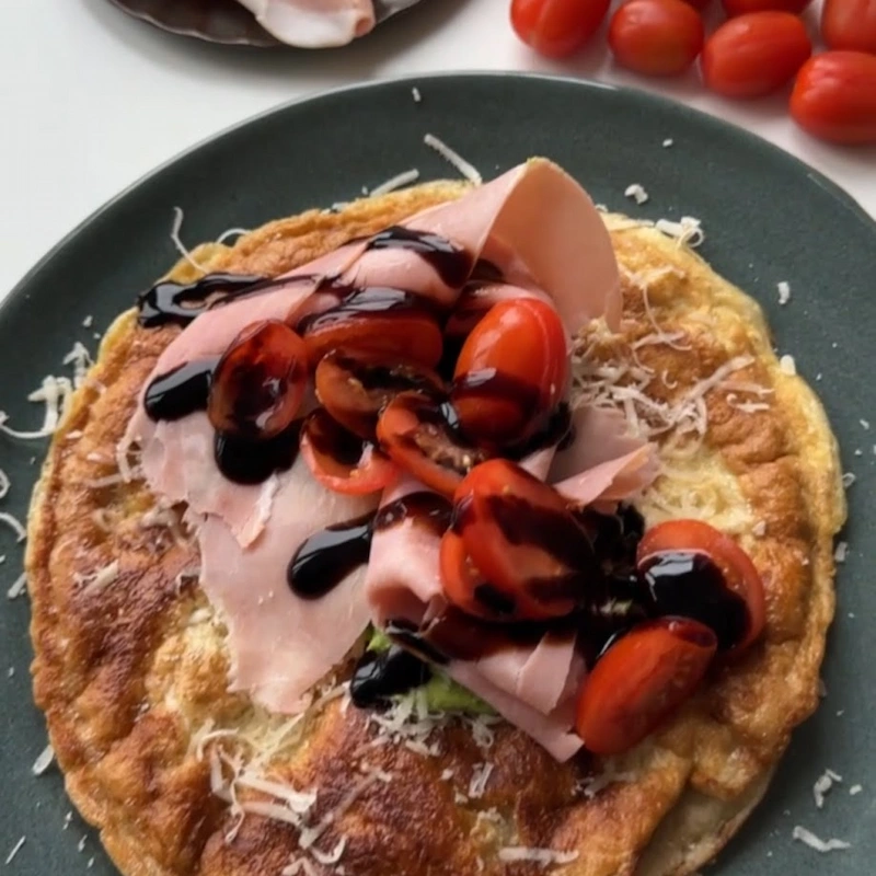 - Kom avocado, tomat, skinke og et drys parmesan og balasamico glace ovenpå fyldet
