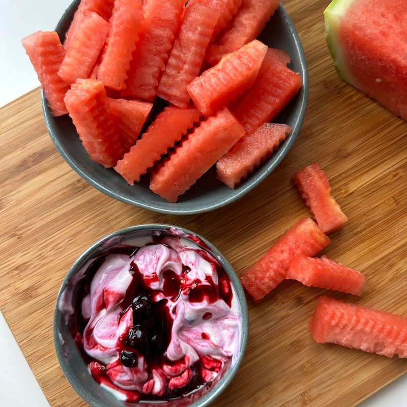 - Skær vandmelonen ud i “fritter” med en pommes frites kniv, som giver fine mønstre